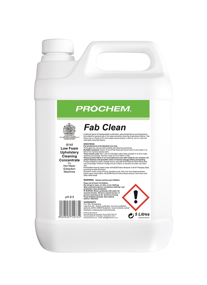 - Upholstery fabric extraction concentrate for use on wet cleanable colourfast fabrics.