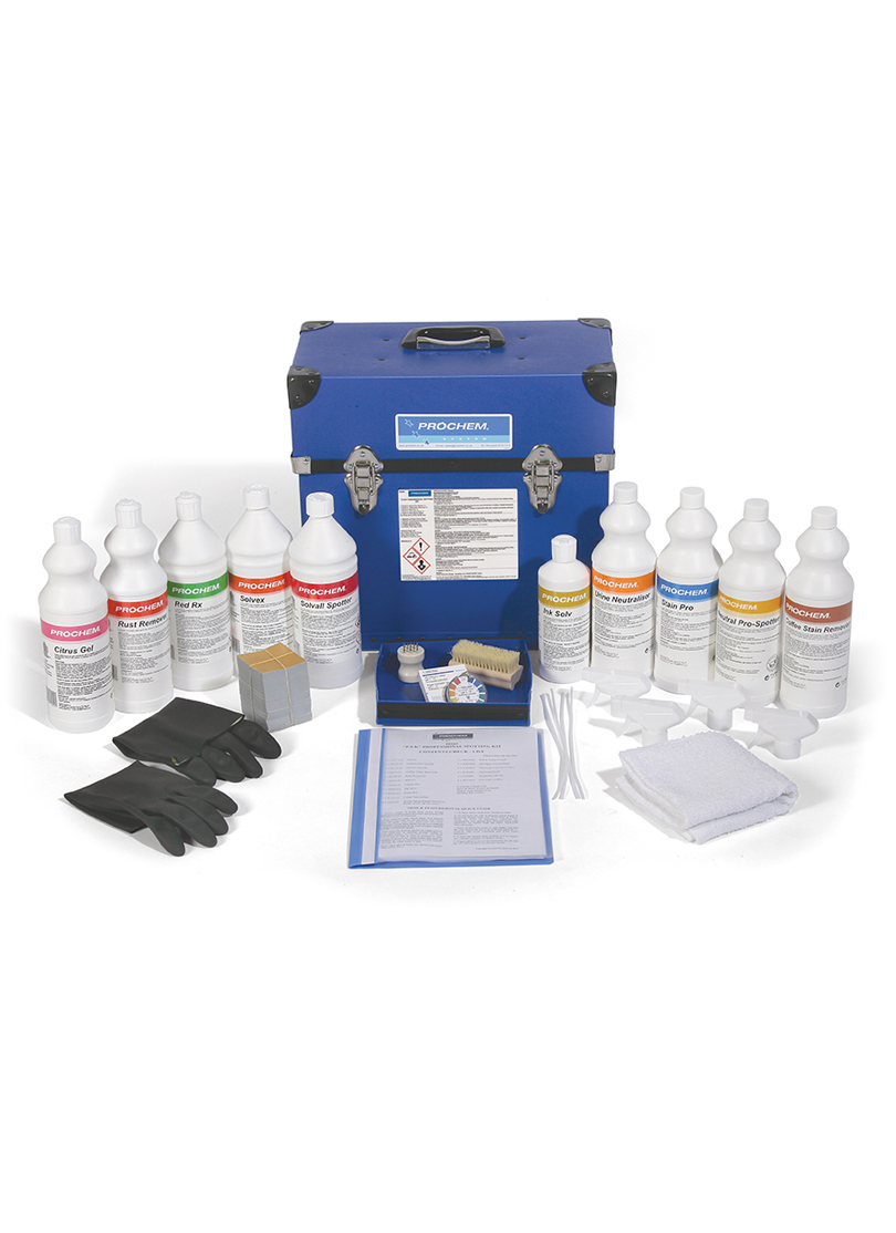 A complete professional kit including a comprehensive range of Prochem chemical spotters and spotting accessories contained in a tough water resistant plastic case. Products may be replenished from the standard Prochem range and individual trigger sprayers may be filled and stored beneath the hinged lid.